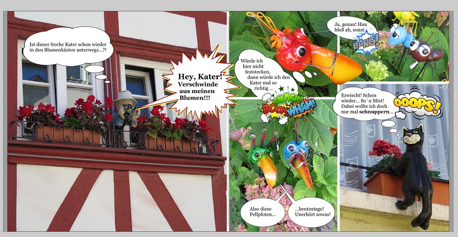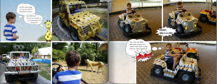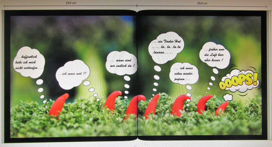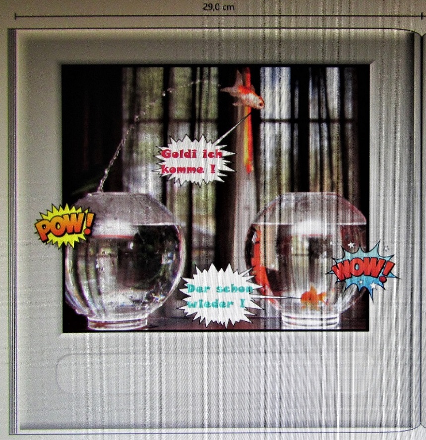 Dafür habe ich vorerst die Fotos in der Fotoschau mit dem Gammafilter und dem Stilisierungsfilter "Ölgemälde" bearbeitet. Leider wird die Veränderung trotz Bestätigung nicht ins Fotobuch übernommen (jedenfalls bei mir nicht). Ich musste mir daher behelfen und habe von der Bearbeitung in der Fotoschau ein screenshot gemacht und diesen dann eingefügt. Anschließend wurden die Fotos mit Masken belegt, Sprechblasen und Texte eingefügt. Die Doppelseiten haben noch verschiedene Hintergründe und die Fotos sind leicht transparent, damit alle Elemente farblich harmonieren.