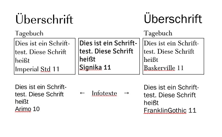 danke für den Screenshot. So kann man die Schriften gleich viel besser einschätzen. Ich muss sagen, mir gefallen die Schriften, die du ausgesucht hast, nicht so gut. Die Schrift, die du für den Tagebuch-Text genommen hast, finde ich zu dick. Gerade bei viel Text macht so ein dominantes Textfeld den Bildern Konkurrenz und das Lesen ist mühsamer. Für die Informationstexte würde ich keine Schreibschrift nehmen, man verbindet Schreibschriften eher mit Tagebucheinträgen. Aber bitte nicht falsch verstehen, bei viel Text würde ich für die persönlichen Texte auch keine Schreibschrift nehmen. Ich habe mal ein paar Vorschläge aus den CEWE-Schriften herausgesucht. Ich bin davon ausgegangen, dass du vielleicht lieber schon installierte Schriften nutzen willst. Falls du dir welche herunterladen willst, kannst du auch mal pittys Tipps (klick) durchforsten, da findest du jede Menge Vorschläge. Ich könnte mir für deine Tagebuch-Texte gut eine Serifenschrift vorstellen und für die Infotexte eine serifenlose - auf dem Screenshot die rechten. Die Schrift Imperial Std hat einen etwas größeren Zeilenabstand, dafür ist die Laufweite schmaler. Das gleicht sich im Fließtext dann wieder aus. Schau mal, ob dir da was zusagt. liebe Grüße