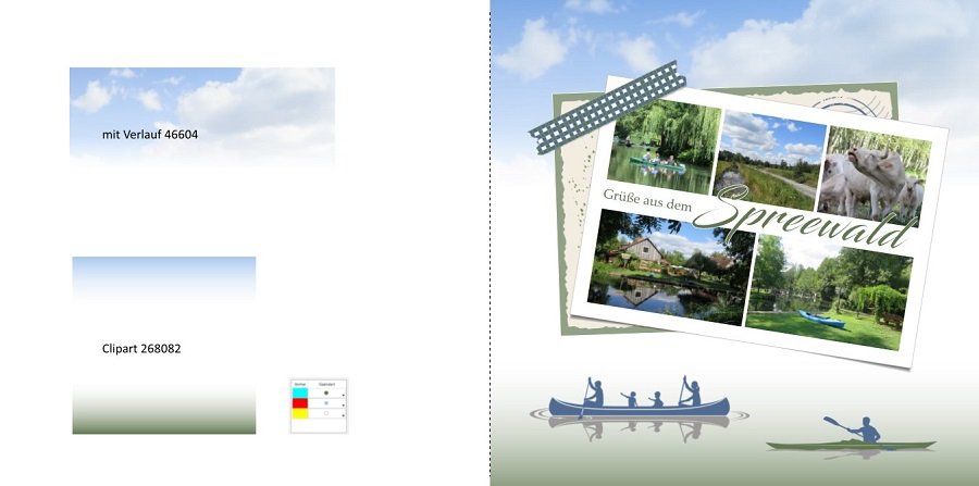 Hallo spica,freut mich, dass Dir meine Gestaltung gefällt. Im Hintergrund liegt seitenfüllend das Clipart 268082, welches ich umgefärbt habe. Die Farben sind aus den Fotos gepickt. Im oberen Viertel bis Drittel liegt ein Wolken-Foto mit Verlauf nach unten. Das Foto habe ich zusätzlich mit einer Transparenz von 40% versehen. Die unten liegende Postkarte habe ich aus mehreren Cliparts gestaltet, welche ich bis auf 128423 alle umgefärbt habe. Wenn ich etwas übersehen habe oder Du noch weitere Fragen hast, melde Dich gern. Viel Spaß beim Gestalten! Deine Informationen zu den Cliparts und Verläufen helfen mir. Herzlichen Dank Mein bisheriger Versuch: PS: ich bin kein Künstler oder Kreativer, aber ein geschickter Handwerker.