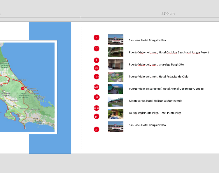 Z.B. bei den Doppelzahlen reicht einfach der Platz nicht. Bei 12/13, ist da ein / oder ein +? kann ich nicht lesen. Zur Anordnung (egal was) hast du ja schon Tipps bekommen. Ich mache es wie Grasmücke. Unter "Anordnen" kannst du Objekte zueinander ausrichten. Arbeite dich da ein wenig ein, das lohnt sich. Ich brauche die Funktionen sehr oft. Schau auch mal, was es beim Schraubenschlüssel noch an Möglichkeiten gibt. Soll eine Seitenzahl zu einem Bild? dann fehlen Bilder. Dann macht es auch keinen Sinn. Ich will dir nicht in dein Buch reinquatschen, aber mir persönlich wäre für eine Übersicht auch etwas viel Text. Ich würde mich auf den Ort beschränken, denn die machst ja später noch ausführliche Seiten, da könntest du dann die Hotels benennen. Auch würde ich bei San Jose (Start und Endpunkt) nicht 2x dasselbe Bild nehmen. Und nimm dir mehr Platz. Es ist so viel Raum, da können die Bilder größer werden und auch die Markierungen. Das nur so am Rande, wie gesagt, es ist dein Buch aber von außen sieht man halt immer anders. Noch viel Spaß beim Basteln und wenn du nicht weiter kommst, hier bekommst du immer Ratschläge Re: Ausrichten und VerteilenWenn du Zahlen in einem Kreis haben willst, empfehle ich dir den Font "Fyra"