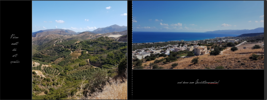 wenn ich Kritik äußern darf: warum benutzt so viele unterschiedliche Schriftarten? Ich erkenne, glaube ich, 4 auf 5 verschiedenen Seiten. Um eine gewisse Struktur in dein Buch zu bekommen, würden m.M. nach 2 vollkommen ausreichen. Einige Schreibschriften sind zumindest im Screenshopt schwer zu lesen. Auf dem 1. Screenshot sind die Abstände unterschiedlich. Ist das so gewollt? Apropos Struktur: die Hintergrundstruktur auf der "Spinalonga-Seite" passt nicht zu dem Berg. Die Wellenstruktur ist zu groß und überspannt den Berg. Wenn du sie unbedingt behalten möchtest, kannst du den Berg per png ausscheniden und einfügen, sodass die Wellen nicht in den Berg reichen. Dann kannst du immer noch eine Transparenz auflegen. Lieben Gruß Pascalinah