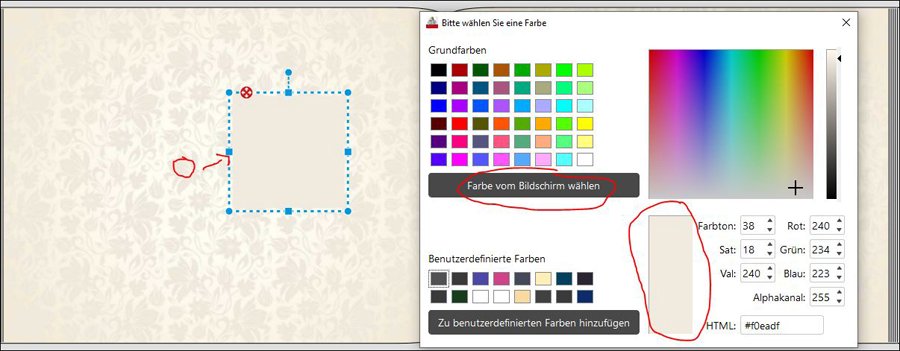 ich habe mal folgendes probiert: Deinen Hintergrund eingefügt und ein Viereck aus den Cliparts in beliebiger Farbe eingefügt. Dieses Clipart habe ich in die Hintergrundfarbe, die lila erscheint, umgefärbt. Diese ermittelte Farbe ist nicht lila. Vielleicht magst du das ja mal probieren. Zur Verdeutlichung hänge ich mein Beispiel an: Danke! Die Idee kam mir gestern abend im Bett auch noch! Liebe Grüße,
