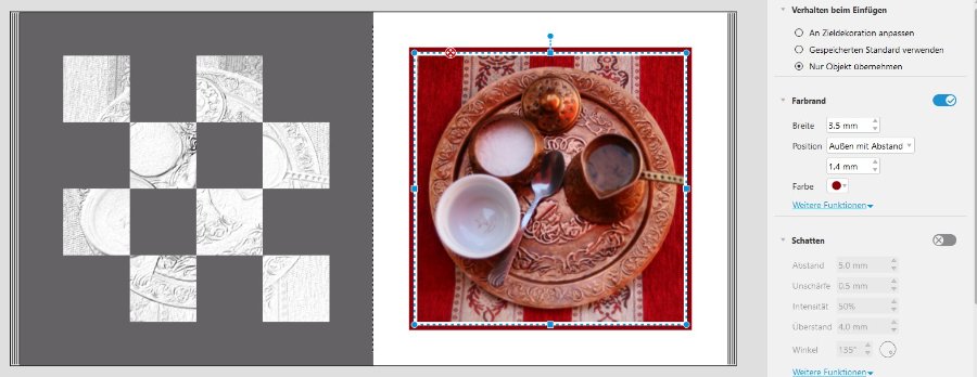einen Trick gibt es leider nicht. Die Gestaltung meines "Küchentuchs" Ich habe zunächst das farbige Originalfoto platziert und den gewünschten Ausschnitt ausgerichtet. Dabei habe ich ein durch 4 teilbares quadratisches Maß verwendet. Das Original habe ich anschließend kopiert und ein weiteres Mal auf der freien linken Buchseite neu eingefügt (STRG+C / STRG+V). Die Kopie habe ich mit Starke Konturen / Nach Transparent ausblenden bearbeitet. Unter den "Zeichnungen" liegen einfarbige weiße Cliparts, um dort das Farbfoto vollständig abzudecken. Wenn die Konturen nach Transparent, statt nach Weiß ausgeblendet werden, gibt mir das die Möglichkeit, so viele Ebenen an Konturen übereinander zu stapeln wie es mir gefällt, um die Konturen sichtbarer zu machen. Bzw. auch Konturen per Dekorieren/Transparenz abzuschwächen, und dennoch das volle Weiß dahinter beizubehalten. Hier kann und muss man einfach etwas spielen. Das große Konturenbild habe ich zunächst in der Breite, dann in der Höhe auf das kleine Maß der weißen Quadrate reduziert. --> Hier unbedingt die Werte einzeln ändern und nicht mit geschlossenem Kettensymbol arbeiten. EDIT: okular hat es über mir schon passend formuliert. Abschließend habe ich das kleine Konturenbild kopiert, noch 7 weitere Male eingefügt, alles jeweils auf den weißen Quadraten platziert und die Ausschnitte ausgerichtet. Hier hilft es oft, das farbige Foto zum Ausrichten etwas transparent zu ziehen. So sieht man leichter, wann die Bilder wirklich deckungsgleich sind. Schau mal, ob Du damit etwas anfangen kannst. Melde Dich auch gern nochmals, wenn Du weitere Fragen hast. @all: Selbstverständlich beantworte ich Fragen zu meinem Buch, bitte aber hier auch um Geduld. Frau macht Urlaub, Frau schaut nicht täglich ins Forum ... usw. Liebe Grüße