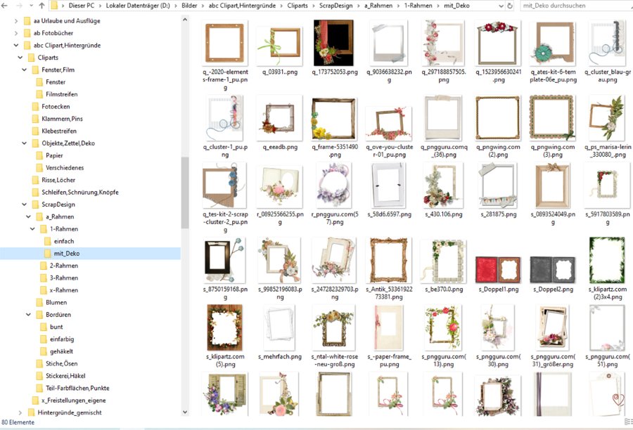 Ich habe mir einen Ordner "Cliparts" angelegt mit vielen Unterordnern. Ist einmal ein Riesenaufwand, aber es ist beim Gestalten super hilfreich, wenn man nicht ewig suchen muss. Und wenn man einen neuen Clipart findet kann man ihn gleich in den richtigen Unterordner kopieren. Als ich noch alle Cliparts in einem Ordner hatte war es dermaßen unübersichtlich. Ich hatte Cliparts, richtig schöne, von denen ich gar nicht mehr wusste, dass ich sie habe LG