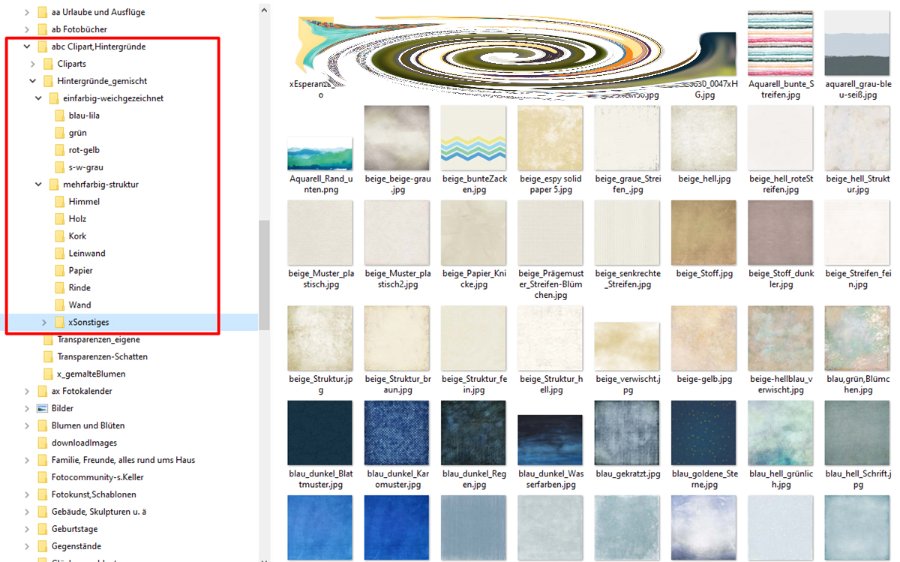 auch ich habe mir extra Ordner mit Themen angelegt. Unter Bilder diverse Ordner wie Fotobuch-Cliparts, Fotobuch-Hintergründe, Fotobuch-Masken etc. und dann jeweils thematische Unterordner wie z.Bsp. Reisen, Flaggen, Landkarten, Farben, Muster, Party usw. Und wichtig, wie Traumfänger bereits erwähnte, zwischendurch aussortieren was nicht mehr gebraucht wird. Liebe Grüße