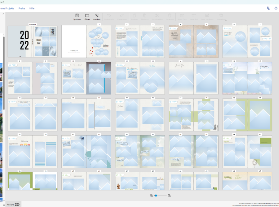 ich habe schon mehrfach eigene Bücher in eine Buchvorlage umgewandelt, dann aber festgestellt, dass ich sie nicht nutze, genauso wie ich gestaltete CEWE-Vorlagen nicht nutze. Daraufhin habe ich die erstellen Buchvorlagen wieder gelöscht. Ich gestalte lieber selber. Wenn ich die eine oder andere Seite als Vorlage verwenden möchte, öffnete ich parallel das infrage kommende Buch und kopiere nur die gewünschte Seite. Aufgrund deiner Frage habe ich meine gespeicherten Projekte durchsucht und tatsächlich eine Vorlage gefunden (die ich aber auch nicht genutzt habe). Es handelte sich um ein Jahrbuch mit 130 Seiten und alle Seiten sind vorhanden. Da ich nicht damit gearbeitet habe, kann ich nicht wirklich sagen, ob die Seiten 1:1 übertragen worden sind, ob das Einfügen klappt oder ähnliches. Probier es einfach aus. Wenn ich meine Buchvorlage öffne, sieht das so aus: Ich habe die vollflächige Minituransicht gewählt, dies ist der Buchanfang. Traumfänger