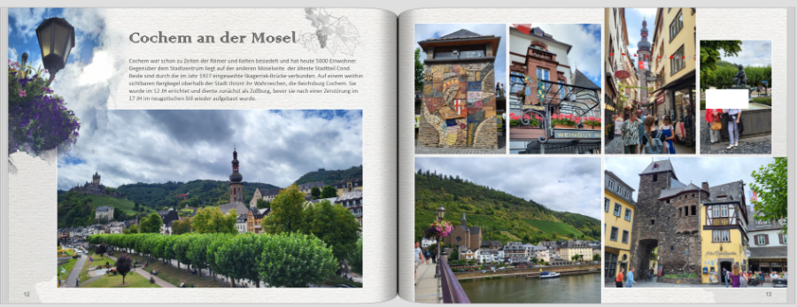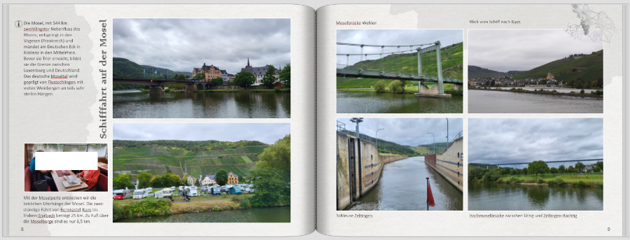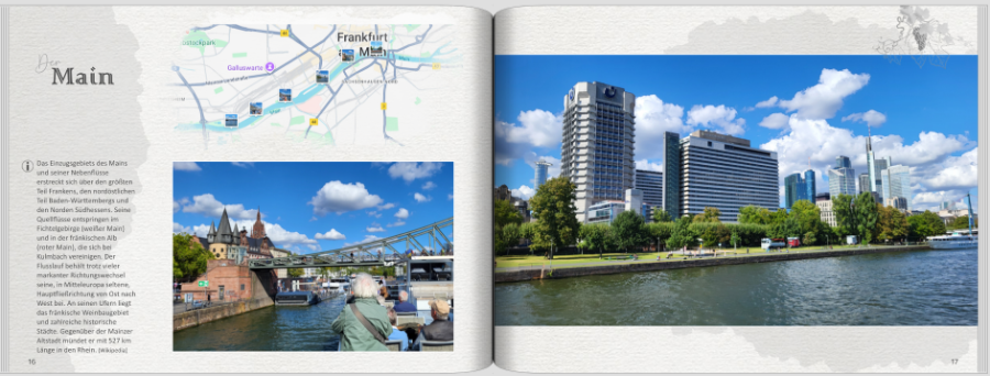 wir haben eine Busfahrt in das schöne Rhein-Main-Gebiet gemacht und jeden Tag stand eine Schifffahrt (Rhein, Main, Mosel, Neckar, Saar) auf dem Programm mit Besuch diverser anliegender Orte. Nun tue ich mich generell mit dem Cover schwer, aber hierfür habe ich null Ideen. So ungefähr sieht die Gestaltung der Innenseiten aus. Bin dankbar für eure Anregungen. Liebe Grüße