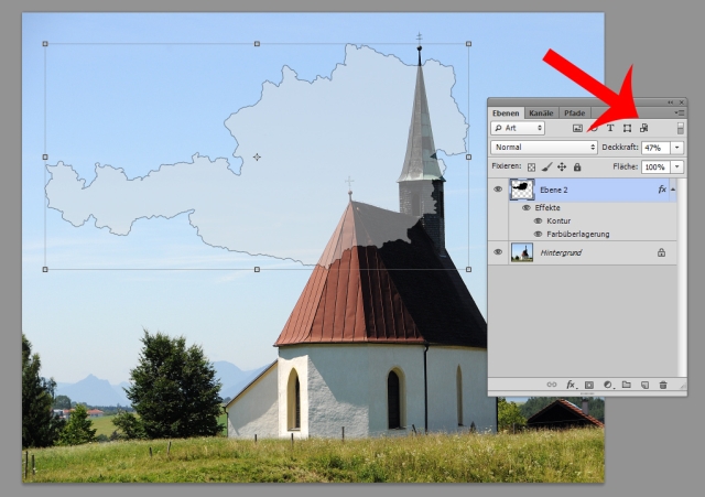 Dies geht ganz einfach: Google nach Karte des gewünschten Landes unter Bilder, schwarz/weiß und png, dann brauchst du fast nichts mehr machen. Du ziehst die Karte auch dein Bild, änderst die Deckkraft und wählst eine Kontur dazu.