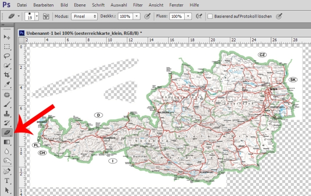 Hast du keine Karte als gif pder png, dann nimm eine normale jpg. Zuerst erstelle gehe unter Dati neu, Hintrgrund transparent. Darauf plazierst du die jpg deiner Karte. Wenn du nicht mit Masken arbeiten willst, dann nimm einfach den Radierer und entferne alles außerhalb der gewünschten Karte: