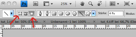 In Photoshop ist es in der Tat ein wenig kompliziert. Am besten, man setzt die Linie auf eine neue, transparente Ebene in PS. Außerdem muss man die Einstellung oben links verändern (siehe Bild). Grundeinstellung bei Formen wie Linien/Kreisen ect. ist die linke Markierung. Wenn man dann eine Linie zieht, erhält man eine Ebenenmaske, mit der man in diesem Fall nicht gerade komfortabel arbeiten kann. Wenn man aber das rechte Bild in der Dreiergruppe anklickt, werden die Formen direkt auf die Ebene gerendert. Daher ist es auch besser, jede Linie auf eine neue Ebene zu setzen. So kann man die Linien später untereinander noch verschrieben.