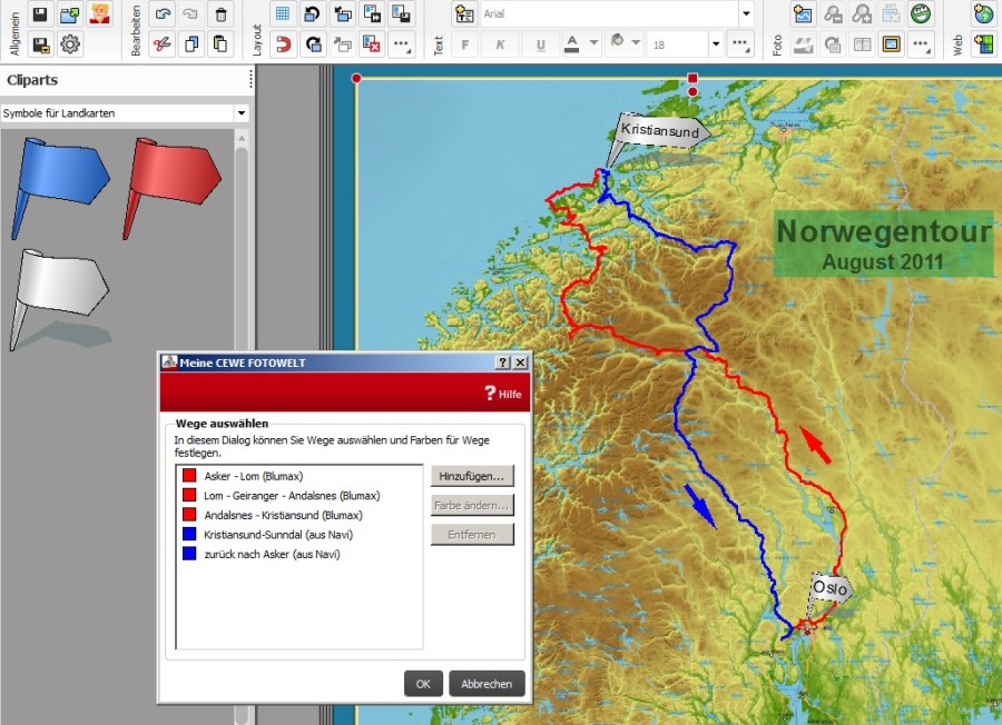 Die Silhouetten der beiden Städte sowie die Richtungspfeile sind übrigens CEWE-Cliparts.