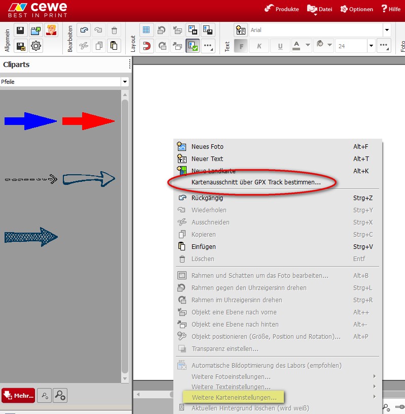 Relativ geräuschlos hat CEWE mit der Version 5.0.2 ein neues interessantes Feature geschaffen. Es ist nun möglich, auf einfache Weise die im Fotobuch generierten Landkarten mit solchen Tracks zu überlagern. Dabei können auch mehrere Tracks kombiniert und in unterschiedlichen Farben dargestellt werden.