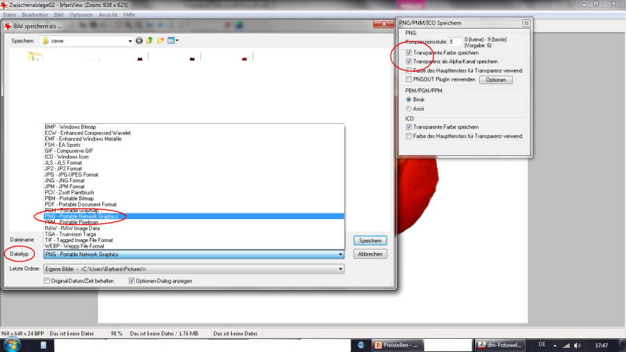 Das Abspeichern als png ist zwar in Powerpoint direkt möglich, aber ich habe nicht gefunden, wo man die Farbe für den Alphakanal (Transparenz) bestimmen kann.Das freigestellte Foto kann direkt aus PowerPoint heraus als .png gespeichert werden. Dazu mit der rechten Maustaste anklicken, im Kontextmenü "Als Grafik speichern" anklicken. Powerpoint bietet dann sofort das .png-Datenformat an. Insofern mußte ich doch noch mal irfanview bemühen. Re: Fotos freistellen mit PowerPointPP mag intelligent sein, ich wohl nicht genug - denn bei meinen Versuchen geht das apselut daneben.