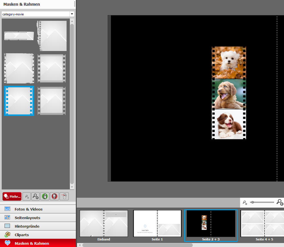 Im Beispiel von Ingrid Gottinger sind kleine Abstände zwischen den Bildern erkennbar, was auf ein arbeiten mit Passepartous hindeutet. Wenn Sie unter "Mehr" im Bereich Film schauen, haben Sie eine Auswahl an Filmstreifen Passepartous: Nun platzieren Sie die gewünschten Bilder in gleicher Größe und etwa dem gleichen Abstand zueinander an. Hierbei können die magnetischen Hilflinien die Anordnung erleichtern. Liebe Grüße