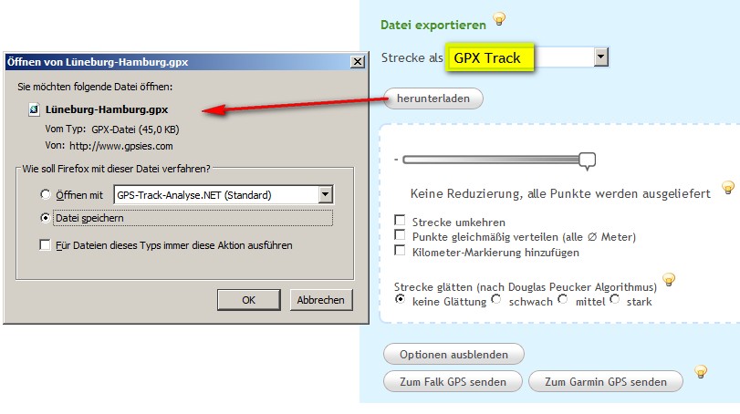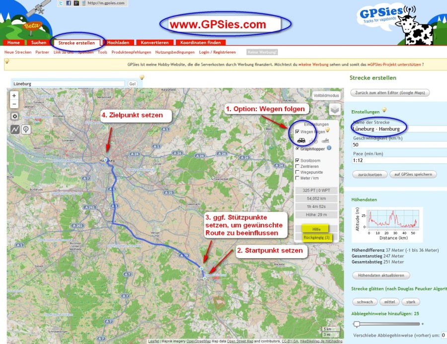 Im zweiten Fall wird eine solche GPX-Datei nachträglich am PC generiert. Mit etwas Übung eignet sich dafür der Streckengenerator der kostenlosen Online-Software GPSies (http://www.GPSies.com). Hier kann man auf einer Kartengrundlage schrittweise eine Route basteln und diese dann auf den PC zur weiteren Verwendung abspeichern. Interessant ist hierbei die Option "Wegen folgen" (d.h. beim Anklicken eines Punktes wird dem verfügbaren Straßen- oder Wegeverlauf automatisch gefolgt). Das zugrundegelegte Verkehrsmittel kann man auch wählen (Auto, Rad, zu Fuß). Hier ein Beispiel für eine Route von Lüneburg nach Hamburg, die mit 4 Mausklicks erzeugt wurde: Wertvoll sind für Ungeübte die "Rückgängig"-Funktion und die Online-Hilfe. Track online basteln: