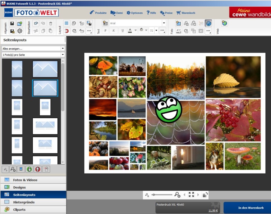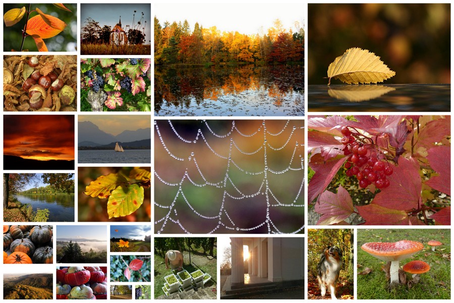 eine ganz schnelle Möglichkeit ist die Collagenfunktion von PICASA. Hier 2 Beispiele, die ich eben aus 24 Bildern der damaligen CEWE-Challenge "Herbstgold" erstellt habe. In beiden wurde das Seitenverhältnis 15x10 quer gewählt. In Poster 1 sind die 24 Fotos automatisch in gleicher Größe auf die Fläche verteilt, in Poster 2 werden verschiedene Größen unter Beibehaltung der Einzelproportionen erzeugt. Der Zwischenraum kann von beliebiger Breite und Farbe sein. Die Positionierung der Bilder kann nach der automatischen Erstellung noch getauscht werden. Bei der Größe kann es allerdings ein Problem mit der Druckqualität geben. Außerdem sind ggf. die Schnitttoleranzen zu beachten. Das ist ja immer ein Problem bei Collagen mit und ohne gestalteten Außenrändern. Re: Collage erstellenVielen Dank für die schnelle Antwort!!!