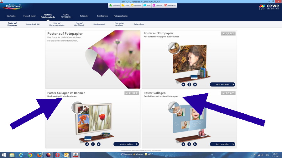 Beim Einlesen einer mittels PICASA erstellten Collage in das CEWE-Poster gibt es also Qualitätsverluste? Gibt es denn bei Cewe selber keine Möglichkeit so eine Collage zu erstellen? Gibt es Vorlagen für einen "Sofortbildkameraabzug" (ich weiß nicht wie ich es beschreiben soll, würde gerne sozusagen mehrere Rahmen eines Sofortbildkameraabzuges nebeneinander reihen und dort hinein jeweils Fotos plazieren z.B. http://csimg.shopwahl.de/srv/DE/2902078 ... n-snap.jpg). Vielen Dank! Re: Collage erstellenHallo!