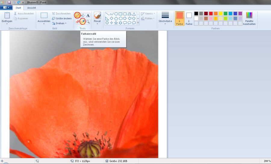 In paint habe ich aber auch gerade mal versucht, kleine Unregelmäßigkeiten zu retuschieren. Das könnte auch gehen, du musst das Ergebnis dann aber sehr genau begutachten, ob du damit zufrieden bist. Das hängt einfach vom Foto und der Hautstruktur um die retuschierten Stellen ab. Diese Malfunktion ist halt keine wirkliche Retuschierfunktion. Die Arbeitsweise wäre folgende: Du wählst zunächst entweder den Stift (rot markiert) oder einen Pinsel aus. Dann nimmst du mit der Farbauswahl-Pipette (ebenfalls rot markiert) den Farbton direkt neben einem Pickel auf und malst anschließend über den Pickel. Die unterschiedlichen Pinsel haben eine unterschiedliche Größe, Struktur und Deckkraft. Die Pinselgröße kannst du unter Strichstärke einstellen. Die Struktur und Deckkraft probierst du am besten selbst aus. Ich finde den "Buntstift" ganz gut geeignet. liebe Grüße