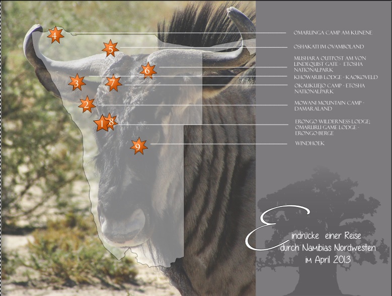 Beispiel 1- Namibia-Reise 2013: Stationen der Rundreise mit Sternchen auf einer transparenten Karte platziert, die zufällig fast genau auf einen Gnukopf paßt. Beispiel 2 - Ein 3-tägiger Ausflug mit Freunden. Die schräg gestellten Bilder wirken nicht so streng und sollen ein bißchen die aufgelockerte Atmosphäre dieser 3 Tage unterstreichen. LG Bäuerin