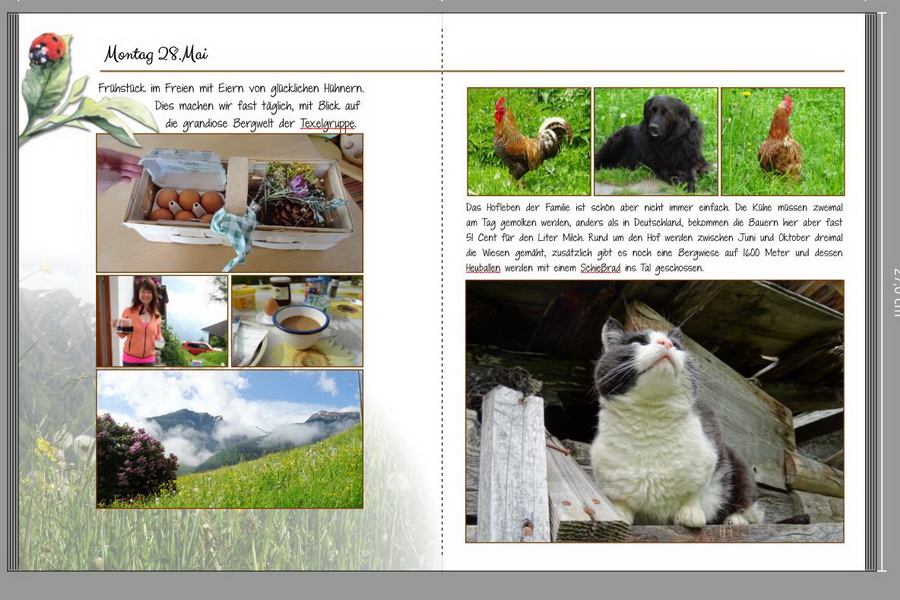 leider habe ich gar keine Ahnung von Gestaltung und ich hoffe Du nimmst es mir nicht übel, wenn ich als „Dummie“ mal meinen Senf dazu gebe. Ich kann selbst in dieser Ansicht alles lesen, aber mir gefällt die „Handschrift“ als Fließtext nicht. Ich glaube mich stören besonders die großen Zeilenabstände. Ich habe keine Ahnung, ob man in der Cewe Software darauf Einfluss hat. Was mich auch stört sind die Minibilder von Dir und dem gedeckten Tisch, da kann ich überhaupt keine Details sehen. Für die Hühner ist die Bildergröße okay. Ich würde versuchen den linken Bildblock in der Größe dem rechten Bildblock anpassen (Breite und Höhe) und auf die kleinen Bilder links verzichten. Ich liebe Katzen, aber in diesem Kontext würde ich darauf verzichten und der Aussicht und den Wiesen/Kühen? mehr Raum geben. Es wird sich ja vielleicht noch ein Plätzchen für die Katze finden lassen. Viele Grüße Annette Re: PasseiertalHallo Martha