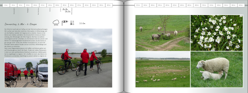Hallo Spica, vielen Dank für deinen netten Kommentar.Sind in der Kopfzeile die Etappen und Euer jeweiliger Radelfortschritt gekennzeichnet? Ich kann auf dem Screenshot leider nix lesen. Die Wetterlage mit den Piktogrammen darzustellen, finde ich eine neckische Idee. Ach ja, und nochmals Hut ab vor Eurer Muskelleistung. Tatsächlich sind in der Kopfzeile Kilometerangaben und Fortschritt der Tour vermerkt. Hier noch einmal ein paar Ausschnitte: Und noch ein Beispiel, wo man den Unterschied sehen kann, in welche Richtung wir gestartet sind. Lieber Gruß Traumfänger Re: Welches Cover?Hallo Traumfänger, Danke für die Vergrößerungen! Ich hatte die Seitenzahlen tatsächlich nicht gesehen und lesen können! Somit ist nun alles perfekt.