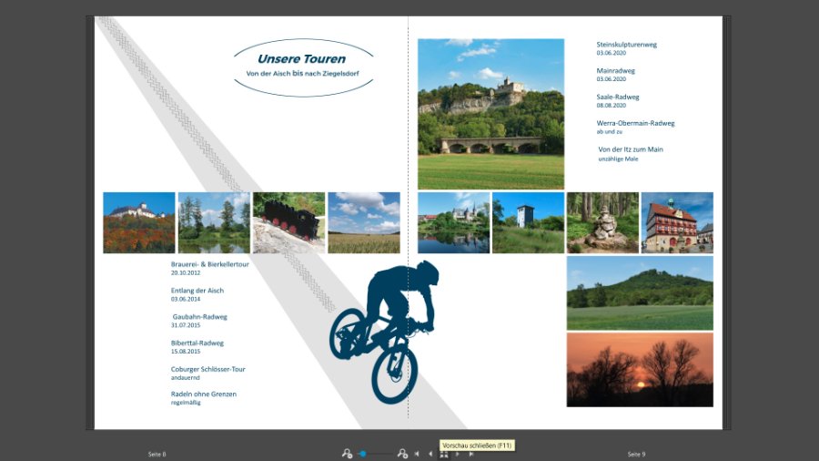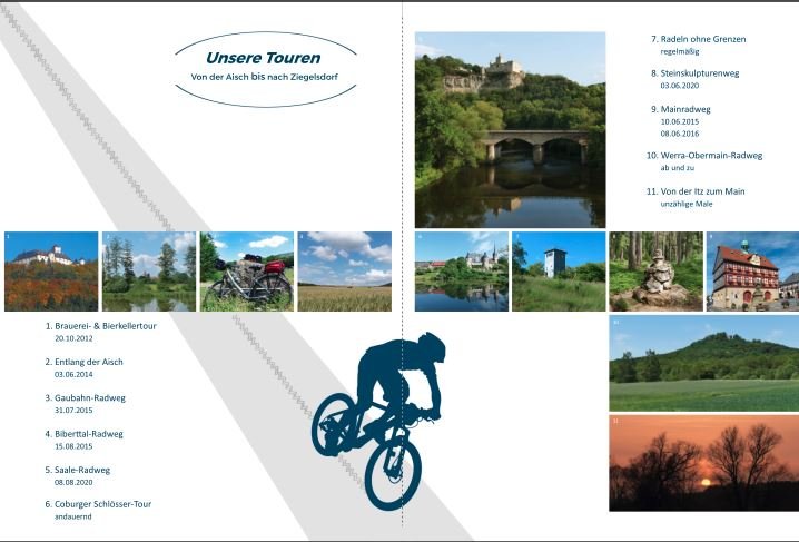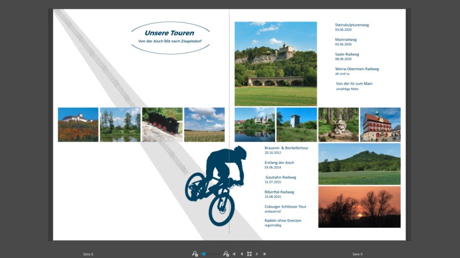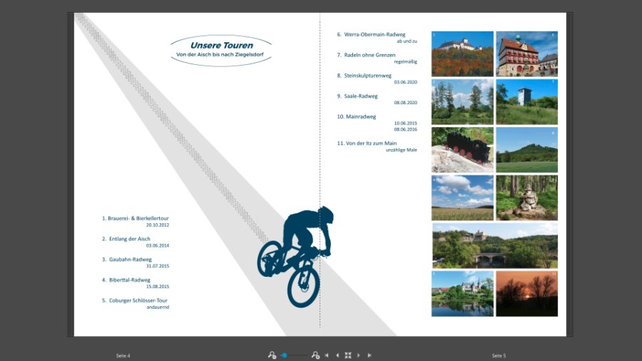 ich dachte schon, es geht nur mir so, dass ich zwischen mehreren Versionen entscheiden muss. ich finde es sieht jetzt schon sehr gut aus. Mir gefällt die Version 2 am Besten. Das mittlere Foto auf der linken Seite würde ich evtl. tauschen. Übrigens ich finde, die Spur passt. Es ist halt eine Abfahrt und die verläuft meist gerade. Viel Spass noch beim weiteren Gestalten. Asiafan @danke für Deinen Tipp mit dem Fahrrad Clipart. Ich habe heute bei meinem Fotobuch erst mal mit der Seite vom Spreeradweg weitergemacht, probiert und auch wieder verworfen. Schau mal wie es Dir gefällt. Liebe Grüße Asiafan