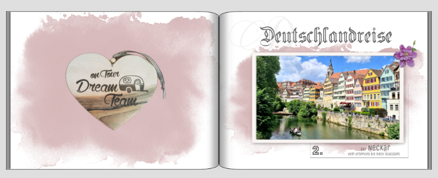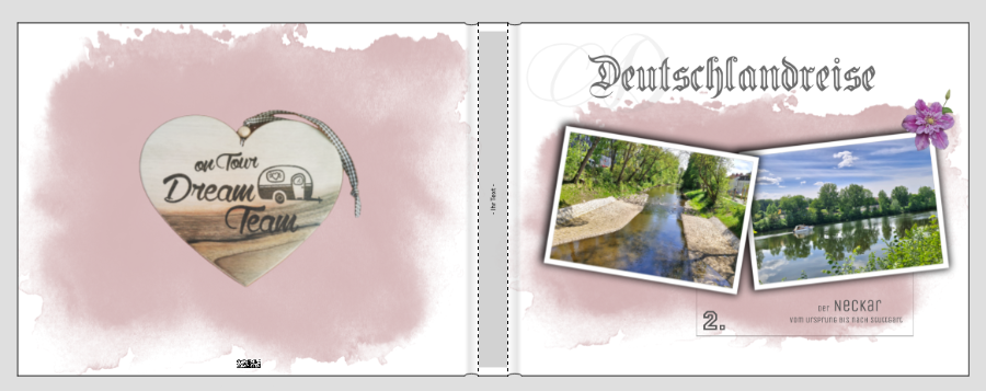 Dennoch möchte ich gerne meinen Eindruck zu deinem ersten Band anmerken. Mir sind es viel zu viele unterschiedliche Schriften, die in meinen Augen leider gar nicht aufeinander abgestimmt sind. Auch spiegelt die gewählte Schrift für "Deutschlandreise" nicht das heutige Deutschland wieder, sondern eines in 80 - 100 Jahren Vergangenheit. Dazu passen aber gar nicht die Bilder und Eure Art des Reisens. Und Seite 8-9: "Bad FÜSSING": Warum diese seltsame Schreibweise? Die gewählte Schriftart unterstützt auch keine Umlaute und ersetzt das "Ü" mit einer Standardschrift. Für Deine weiteren Bände würde ich daher die Art und Anzahl der gewählten Schriften überdenken. Wenn ich es richtig erkannt habe, verwendest Du für Dein Cover u.a. "Germanica" und "Unica One". Damit habe ich einmal gebastelt. Die übrigen Schriften habe ich eliminiert. Wichtig war mir, Deine Ursprungsgestaltung beizubehalten, aber frischer und moderner zu gestalten. "Flutet Germanica" habe ich durch "Plain Germanica" ersetzt und per weiß mit Schatten in ihrer Wirkung zurückgenommen. Auch habe ich den Farbfleck aus den Bildern gepickt. Das Altrosa finde ich gar nicht in den Fotos wieder und empfinde es daher auf Deinem Entwurf nicht stimmig. Mir persönlich gefällt die Variante mit 2 Fotos besser. Aber das mag auch daran liegen, dass ich Deine Fotos verwenden wollte, aber durch den Screenshot nur eine nicht so berauschende Qualität hinbekomme. Ich hoffe, Du nimmst mir meine Kritik nicht krumm und kannst vielleicht für die Folgebände für Dich passende Impulse mitnehmen. Liebe Grüße