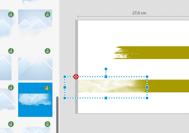 Wie hast den den orange Streifen, auf dem die Fotos liegen, erstellt? Hier liegt ein Clipart aus dieser Auswahl Darauf liegt ein einfarbiges Bild in Wunschfarbe, erstellt mit der Malen-Funktion in der CEWE Fotoschau, welches mit der Maske #99043 versehen ist. Die genannten Cliparts lassen sich leider nicht umfärben, daher der Umweg, sie anders farblich zu verändern. Achtung: Du müsstest schauen, ob Du das Farbfoto rechts und links evtl. nicht ganz so breit ziehst wie das Clipart, da sonst die rechteckige Kontur des Farbbildes leicht sichtbar ist oder aber halt das Originalclipart: Liebe Grüße