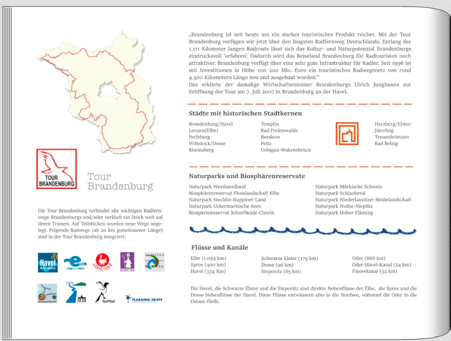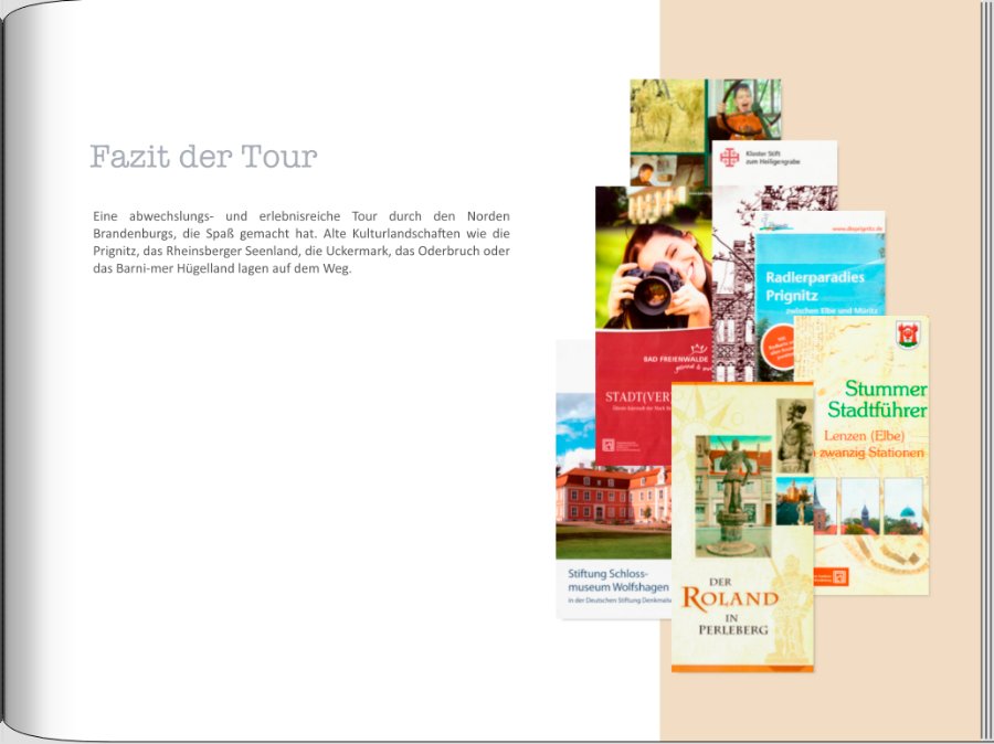 Kunigunde Re: (Rad-)Tour Brandenburg Nord.Zur letzten Seite: Die Idee mit dem (umgefärbten) Eisbecher zum Text und zum Foto finde ich hübsch. Das würde ich gar nicht ändern, sondern mit den kleinen Änderungen, die Du beschreibst, so lassen, wie Du es schon gestaltet hast. Die Prospekte auf der rechten Seite würde ich überlappender anordnen und dabei in Kauf nehmen, dass ein Teil der Prospekte dabei jeweils nicht vollständig sichtbar ist.