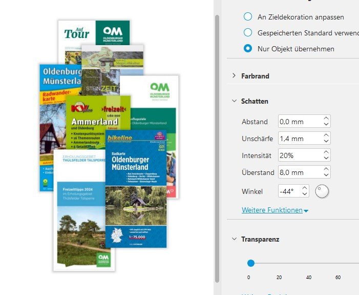 Schwierigkeiten bereitet mir noch das „Schloss-Wolfshagen-Prospekt“, weil ich Angst habe, dass sich die linke obere reinweiße Ecke nicht stark genug von den ebenfalls weißen Hintergrund abhebt. Hat jemand eine Idee für das Problem? Ich möchte nicht unbedingt die Anordnung der Prospeke tauschen …