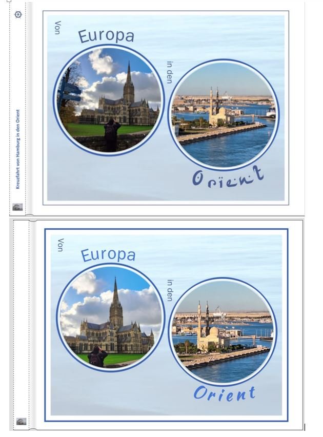 Falls du allerdings mehr Wert auf "von x nach y" legst, passen einfach zwei Bilder besser. Warum hast du eigentlich beim Startpunkt Hamburg genannt und beim Endpunkt eine Region? Klingt ja so als hättet Ihr vor der Kreuzfahrt kein großes Sightseeing in HH gemacht. Wie wäre es denn mit "Von Europa in den Orient"? Da wärst du freier in der Bildauswahl und wenn du die Fotos versetzt zueinander ausrichtest, entspricht das ungefähr der wirklichen geografischen Lage. Unterschiedliche Schriften könntest du dann auch für Europa und Orient nehmen. Ich hänge mal eine kleine Skizze an. Für mehr habe ich momentan keine Zeit. Vielleicht ist es eine Anregung. LG wulle