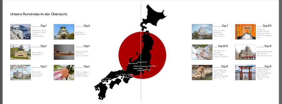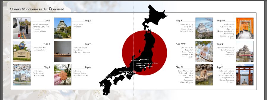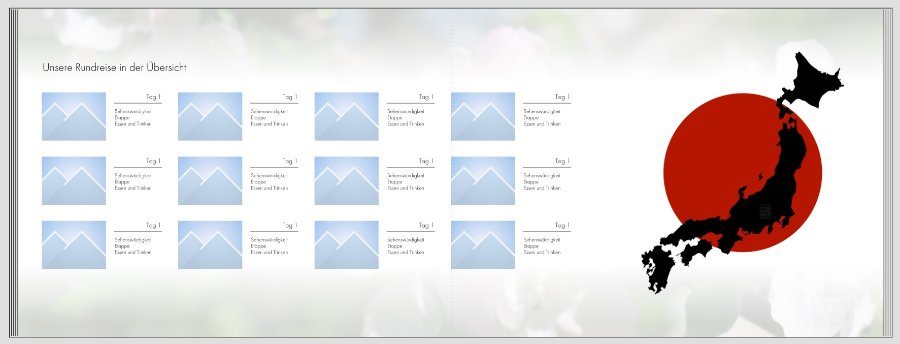 So gefällt es mir sehr gut, mit dem Querformat. Ich denke den Rahmen lasse ich mal weg, wie auch Traumfänger schon geraten hat, und vielleicht probier ich das mit einem weißen Verlauf und den Kirschblüten im Hintergrung... Vielleicht passt ohne Rahmen das Querformat auch in den 2 Blöcken, wie ich es jetzt habe platztechnisch besser. Werde da mal herumbasteln am Abend!JapanNiciH.jpg Wie von Traumfänger geschrieben, würde ich den weißen Hintergrund nicht umranden. Ich würde entweder auf den dezenten Blumenhintergrund verzichten und alles weiß lassen oder ein weißes Bild nach oben und unten verlaufen lassen (#99016) wie gezeigt. Die Fotoplatzhalter in meinem Beispiel sind 4x3 cm groß. Schriftgröße Function bei der danebenstehenden Tagesbeschreibung ist 12 pt für "Tag 1" und 10 pt für den folgenden Text. Vielleicht kannst Du aus meiner Überlegung ein passendes Layout für Dich basteln. EDIT: Hm, komisch ..., der Screenshot hier im Beitrag verschluckt die Falz-Linie. Daher als Nachtrag: Die linke Bildkante der rechten Bildspalte sitzt genau auf dem Falz. So ist alles gleichmäßig verteilt, überlappt aber trotz Layflat nicht den Falz. Liebe Grüße,
