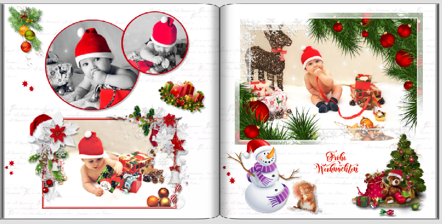 es ist schwer, Ratschläge zu geben, wenn man selbst einen komplett anderen Stil bevorzugt. Aber für mein Empfinden hat die Seite viel zu viel "Schnickschnack" und das arme Kind gerät da völlig in den Hintergrund. Ein paar Gedanken von mir. Den größten Platz-Anteil hat das Weihnachtsbaum-Clipart. Ist das wirklich das wichtigste Element auf dieser Seite ? Wieso hat der Elch ausgeblendete Hörner ? (bzw. braucht man den Elch überhaupt ?) Wäre es nicht schöner, z.B. das Foto von links oben nahezu ganzseitig darzustellen ? Die "Bilder-Kugel-Idee" der rechten Seite finde ich sehr passend. Evtl. sollte man das als Gestaltungselement für alle Bilder übernehmen ? Soweit meine Gedanken, bitte nur das "rausnehmen", was zu Deinem Stil passt. Gruß DSL-schnell