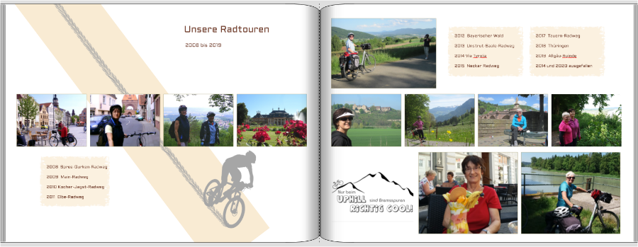 ich bin mit meinem Buch noch nicht weitergekommen, das Wetter ist zwar eher zum Gestalten als zum Radeln, aber trotzdem..... Nun zu Deinem Inhaltsverzeichnis: Die "Straße solltest Du noch etwas weiter nach unten ziehen, damit sie nicht im "Nirgendwo" aufhört (obwohl uns Radlern das schon mal passiert...). Die Abstände zwischen den kleineren Fotos in der Mittelreihe und den etwas größeren Fotos oben und unten sind nicht identisch. Der Radler stößt mit dem Kopf an ein Foto. Die Spur müsste bis zum Vorderrad gehen (wie viele Stunden hast Du an der Spur gesessen? Re: Radtouren Buch Eure MeinungReisetante hat geschrieben: