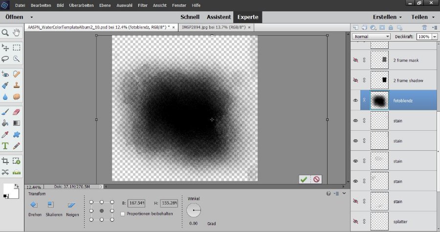 Bezüglich deiner zweiten Frage : Ich benutze Photoshop Elements. 1. Maske, Bild und Rahmen öffnen, dann Datei NEU (transparent) öffnen 2. auf diese transparente Ebene die Maske legen, im oberen Reiter BILD- transformieren- frei transformieren, kannst du die Maske größer oder kleiner ziehen und drehen, so wie du es haben willst. 3. Foto darauflegen, wenn erforderlich ebenfalls mit BILD- transformieren- frei transformieren, in Form ziehen. Wenn dann noch schwarze Teile der Maske zu sehen sind, gehst du bei den Ebenen (rechts) noch mal mit dem Körser auf Maske und schiebst sie in Form, so das das Bild die Maske völlig überdeckt. 4. Nun hast du mehrere Ebenen, die du auf der Spalte rechts siehst, mit dem Körser und mit Klick der rechten Maustaste gehst du im Reiter auf SCHNITTMASKE erstellen. 5. Danach legst du noch den Rahmen auf, ziehst ihn wieder in Größe und Position, wie du möchtest. Dann gehst du auf den oberen Reiter EBENE- sichtbare auf eine Ebene reduzieren. Damit hast du das fertige Bild, welches du dann als PNG abspeichern kannst. Re: auch SrapbookLiebe Andrea, du kannst natürlich auch ein Vorlagen Template in Elements aufrufen, ich weiß ja nicht was du dir bei Oscraps gekauft hast.
