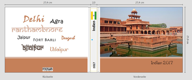 die Streifen sind die Farben und die Form der Landesflagge von Indien. Da ja nicht alle Flaggen Streifen unten und oben haben, habe ich nun die Streifen nach unten versetzt und die Breite der Streifen abgeändert. Die Breiten sind willkürlich gewählt. Ich habe das mal nach dem "Goldenen Schnitt" probiert, aber ich denke dann wird der Streifen insgesamt zu breit. Mit einer ruhigeren Farbe ist das ok (wie im Beispiel "Namibia"), aber in meinem Fall würde der Streifen dann zuviel von dem Bild nehmen. Die Schriftart "Brahmi" von "Indien 2017" habe ich im ganzen Buch verwendet. Sie ist auch auf der Rückseite im Ort "Kumbhalgarh" LG Anna Re: Buchrücken AufteilungNS: der linke Bildrand reicht bis an das Textfeld