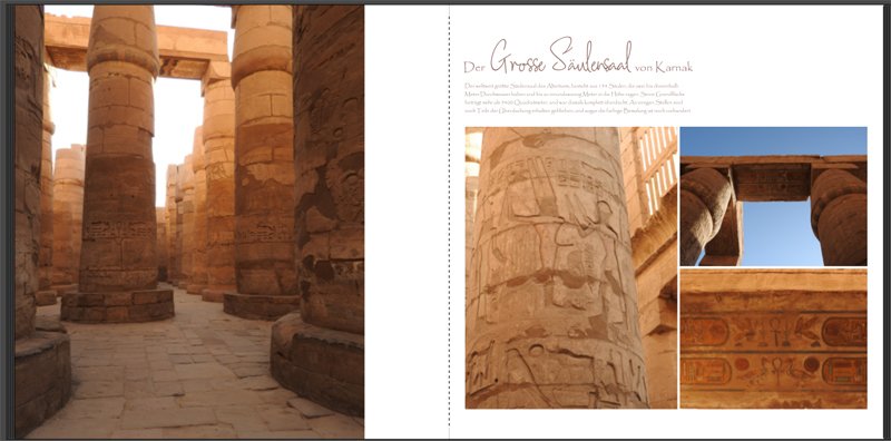 Irgendwie passt mir der Skarabäus auch nicht so wirklich in den Kram, und andere Seiten gibt es nicht mehr wo er Platz hätte. Würde ihn aber trotzdem gern im Buch haben, da ich ihn mit einer lustigen Erinnerung verbinde Ich würde das Foto auf der linken Seite verschmälern, sodass fast nur die Statue zu sehen ist. Den Skarabäus würde ich weglassen. Liebe Grüße,