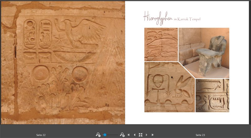hab jetzt nur mal kurz reingeschaut. Was mir sehr gut gefällt ist das Layout der 2. Doppelseite mit den abgeschräkten Ecken. Versuch doch mal dieses Layout auch mal bei den Hyroglyphen. Kannst Du das nächste Mal evtl. die Doppelseiten zuordnen. Ich hab mich jetzt am Bildschirm etwas schwer getan, dass ich die DS welche ich meine richtig angebe. Bei den nächtlichen Impressionen gefällt mir der weiße Hintergrund besser. Weiter viel Spass beim Gestalten. Liebe Grüße Asiafan