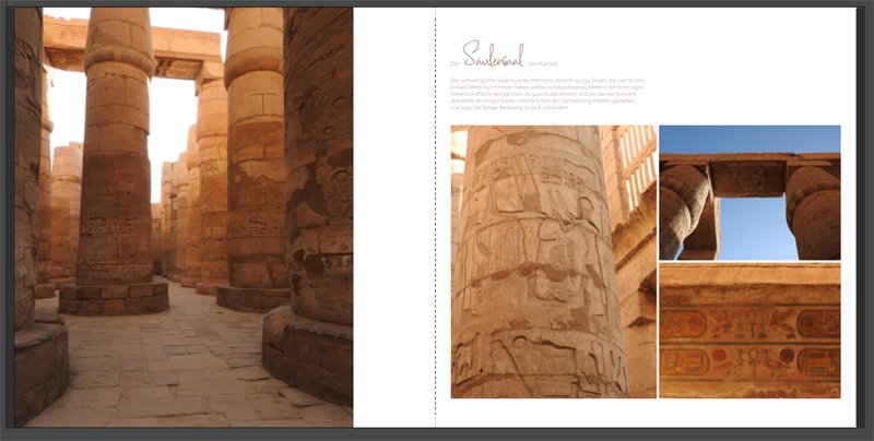 Ich fürchte, dass ich nicht in Deinem Sinne antworten werde Aber vielleicht passt es Dir ja doch. Das ß ist dann bei einem Font entbehrlich, wenn kein Wort mit ß vorkommt. Der Umgang mit deutscher Rechtschreibung wird hier ja gerade auch in einem anderen Beitrag diskutiert. Ich mache natürlich auch Fehler, aber nie mit Absicht. Lösungsvorschlag: verzichte auf das Wort groß, m.W. gibt es keinen kleinen Saal. Auch scheint es mir kein Eigenname zu sein. Ich kenne auch eher den Begriff Säulenhalle. Wiki schreibt hier von der Hypostylhalle. Zur Schriftgröße - Southampton Hier bist Du völlig frei. Headlines dürfen auch über Fotos dominieren. Willst Du das? Gefühlt dürfte die Headline gut 1/3 kleiner sein. Papyrus Ich sehe erst jetzt, dass Du diese Schrift auch für den Fließtext einsetzt. Das würde ich niemals machen. Sie ist durch ihren sehr schlechten Zeichenausgleich (siehe Dein Schriftlinienbeispiel - wie schlecht stehen das e zum T und das a zum K) und ausgefransten Striche sehr schlecht lesbar. Eine Schrift, die aus dem Hocker haut, hast Du doch schon. Nimm was Lesbares. Und dann reichen locker 10-12 Punkt je nach Sehstärke. Ich habe es jetzt mit Corbel Light in 11pt für den Fließtext versucht. Für die Überschriften habe ich 13pt genommen, damit es sich etwas vom Fließtext abhebt, und 55pt für Southampton. Die kleinere Schrift passt jetzt besser denke ich, aber ansonsten gefällt es mir irgendwie nicht wirklich... Liebe Grüße,