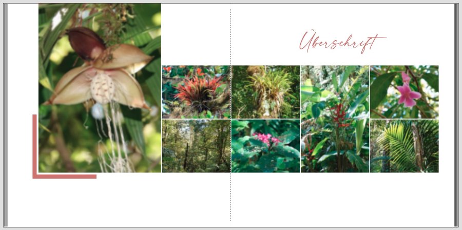 hier zwei Anordnungsideen für Deine Pflanzenseite. Vielleicht kannst Du daraus für Dich etwas ableiten. Grundsätzlich würde ich ein Layout wählen, was beide Einzelseiten miteinander verbindet. Die jetzige unterschiedliche Anordnung grenzt die Seiten eher voneinander ab. Die Tierseite gefällt mir super! Hier würde ich nur an Kleinigkeiten zupfen. Vielleicht kannst Du z.B. noch etwas von dem Ast freistellen, auf dem der Vogel sitzt? Das würde der Freistellung noch mehr Harmonie geben, finde ich. Und ein wenig an der Ausrichtung der Linien würde ich noch schieben. Die obere und untere Bildkante vom Nasenbär würde ich auf jeweils eine Linie mit den Bildkanten der Vögel bringen. Die kleinen Winkel bei den Vögeln scheinen nicht ganz symmetrisch zu sitzen. Rechts/links scheint mir minimal schmaler als oben/unten, aber das kann auch optisch täuschen. Und die kleinen Textzeilen würde ich in der Anordnung einmal unterhalb der Bilder probieren. Beim Nasenbären rechtsbündig, bei den Vögeln linksbündig ausgerichtet. Liebe Grüße