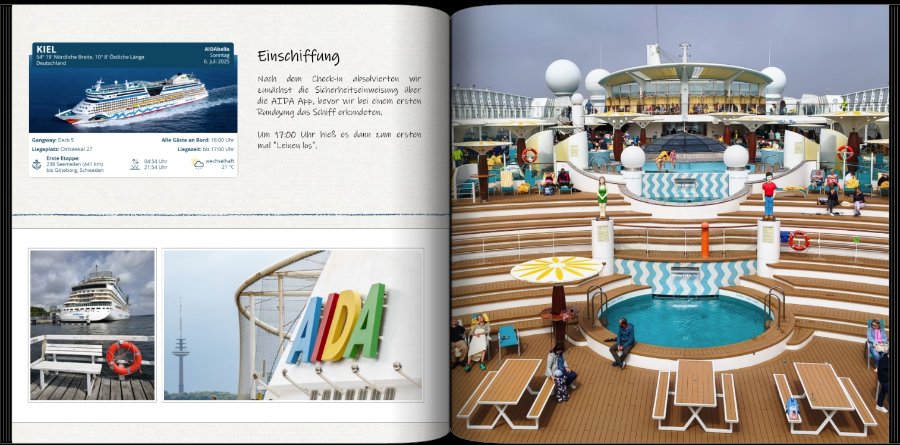 die Kapitelöffner-Seite gefällt mir sehr gut, sie ist gut gegliedert, übersichtlich und nciht überladen. Eine Kleinigkeit ist mir aufgefallen: Rechts oben über dem Datum schreibt Du immer "AIDAbella". Wozu ist diese Information? Ihr wart doch die ganze Zeit auf dem gleichen Schiff, und auf welchem schreibt Du ja schon auf der 1. Seite. Ich würde das einfach weglassen. Viele Grüsse