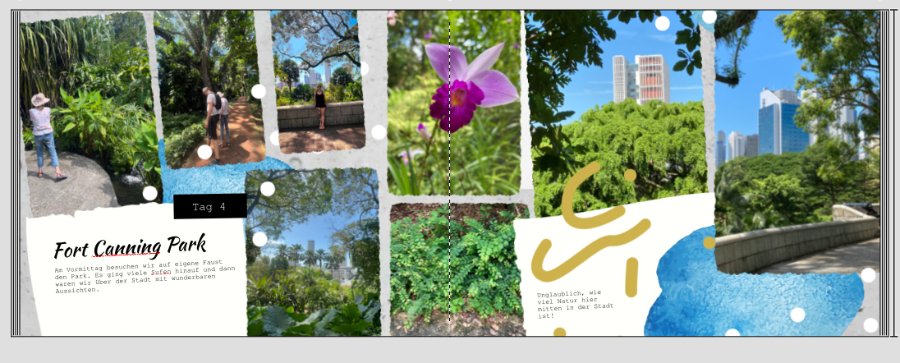 Genau so geht es mir auch. Aber wir sind natürlich auch eher die "Schnörkellosen".also mein Stil ist das auch nicht, die Fotos kommen für mich nicht so richtig zur Geltung. Da ist für mich zu viel was ablenkt, aber es muss euch gefallen, nicht mir. Viele Grüße Hans-Jürgen Ich finde es schwer, ein Buch für Andere zu machen, vor allem, wenn ich da nicht meinem eigenen Stil folgen könnte. Ich habe aber auch schon eher verspielte Bücher gemacht, aber nur, wenn es zum Thema passt. Mal ein Weihnachtsbackbuch und auch ein Fotobuch über Italien, weil da einfach alles weich und romantisch ist. Was nun aber Singapur angeht, da finde ich diesen modernen, wilden Stil schon sehr schwierig. Ich war schon oft in Singapur und so kenne ich die Stadt nicht. Eher klar, sauber, modern, edel. Da würde ich immer einen etwas klareren Stil bevorzugen. Ich finde, schöne Fotos brauchen Platz. Eine eher chaotische Gestaltung würde ich nur nehmen, wenn es um die Stimmung geht und nicht um die Bilder. Also eher in Richtung Spaßfotos. Aber da stimme ich Hans-Jürgen zu: Es ist euer Buch, es muss dir (bzw. den jungen Leuten) gefallen. Vielleicht kannst du auch versuchen, die Vorlage etwas zu glätten, also ein paar Platzhalter entfernen, etwas weniger Schnörkel und zwischendurch mal ein paar großflächige Bilder. Gruß Monika Re: Mal ein andderes LayoutIch kann den anderen nur zustimmen.