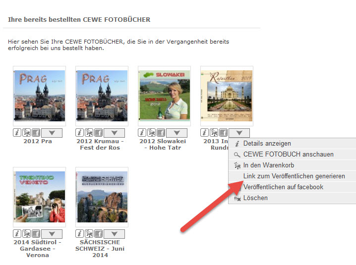 Hmm, ich fürchte, da habe ich zu wenig von der Historie zitiert. Ich war gedanklich bei der Galerie, wo der Handelspartner meine bei ihm bestellten Fotobücher eine zeitlang vorhält. *) Zur Historie: Zuerst kam die Anregung, die Auftragsnummer aus der Galerie (=Beim Handelspartner jüngst bestellte Bücher; nicht die Galerie vom FotobuchWettbewerb) herauszulesen. Dann kam die Frage, wie man zu dieser Galerie kommt. Nach Auffinden der Galerie ging es dann darum, was das "Veröffentlichen" eines Fotobuchs bedeutet. Re: Kundenbeispiele gezielt findenVielleicht haben wir uns etwas verzettelt. Meine Freunde im Ausland möchten sich meine Fotobücher ansehen. Ich habe ja nicht alle meine Bücher bei den Kundenbeispielen, bzw dauert es etliche Monate, bis es veröffentlicht wird. Ich habe mein Rom-Buch schon im Februar eingereicht, sehen kann ich es noch nicht, habe aber auch keine Absage erhalten. Die zwei Bücher die ich beim Fotowettbewerb eingereicht habe, sind sehr klein und in schlechter Auflösung. Außerdem reiche ich nur die ein, wo natürlich keine anderen Leute erkennbar sind. Hochzeitsbücher würde ich nie im Leben veröffentlichen, aber mit meinen Freunden teilen. Daher der Tipp mit "meine Galerie" vom Handelspartner. Dort finde ich Bücher von 2012 aber mit falschem Cover, andere neuere Bücher gar nicht. Dort könnte ich einen Link zum Weiterleiten generieren, mich hatte aber der Hinweis " Link zum Veröffentlichen generieren" iritiert. Jetzt ist alles klar, vielen Dank.