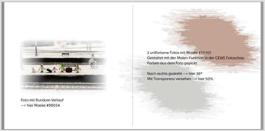 Meistens führen verschiedene Wege zum Ziel. Unter dem Kalender steht, wie es gemacht wurde: " ich habe zwischen drei bis 5 Fotos pro Seite übereinandergelegt und jeweils nur mit der Maske 111101 und dazu passenden Farben bearbeitet".Nichts spricht dagegen, einfach zu probieren, das Ergebnis muss doch nicht 1 : 1 dasselbe sein. Nur Mut! Lieber Gruß Traumfänger Re: KalenderIch muss mich entschuldigen, da ich fälschlicherweise davon ausgegangen bin, dass man sieht, dass das erste Foto mit einer Verlaufsmaske belegt ist und die Farbbilder dahinter alle mit der Maske 111101 ausgestattet sind. Nehmt es mir bitte nicht krumm……..