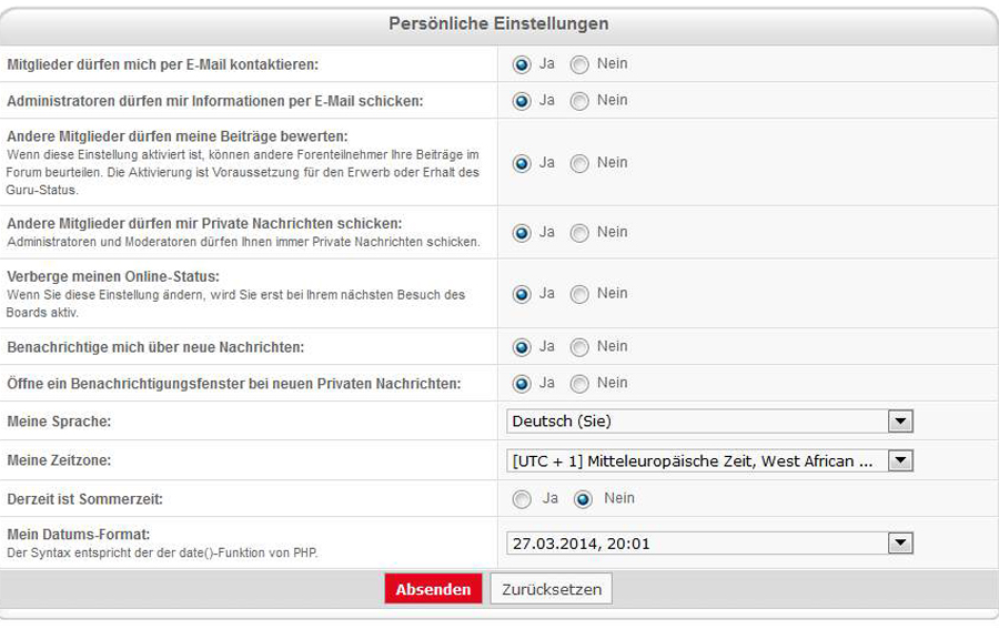 ich habe mir einige Profile angesehen und festgestellt, dass einige von Ihnen die Grundeinstellung "Benachrichtige mich über neue Nachrichten" auf "Nein" gesetzt haben. Ich habe das bei einigen Forenteilnehmer des Beitrages nun geändert. Bitte beobachten Sie das Verhalten in den nächsten Tagen. Sollte die Mails weiterhin nicht gesendet werden, bitte melden. Sylke Re: keine Email-Benachrichtigungen bei neuen Antworten ???Daran wird es wohl liegen.