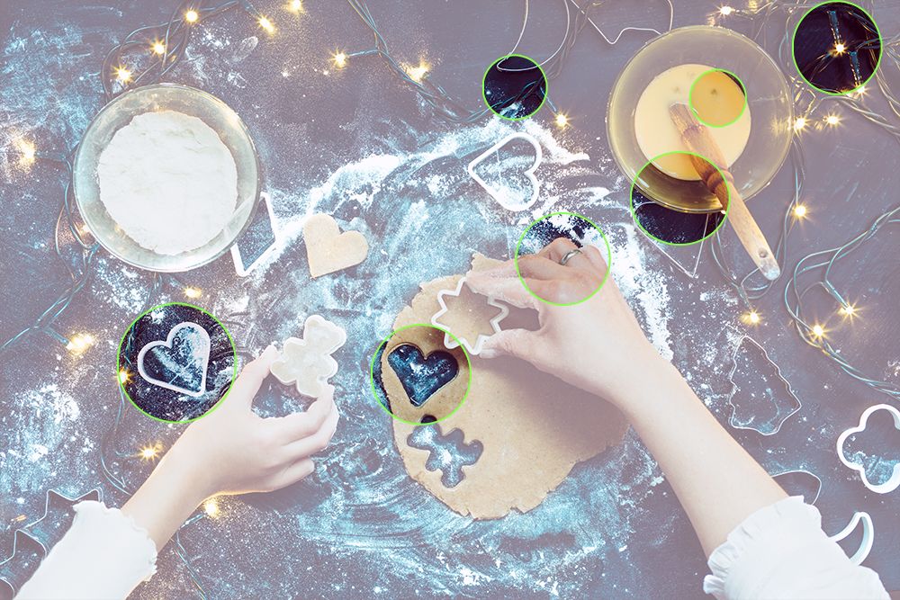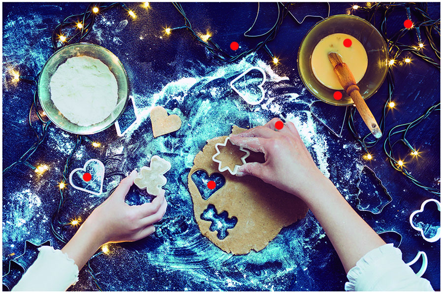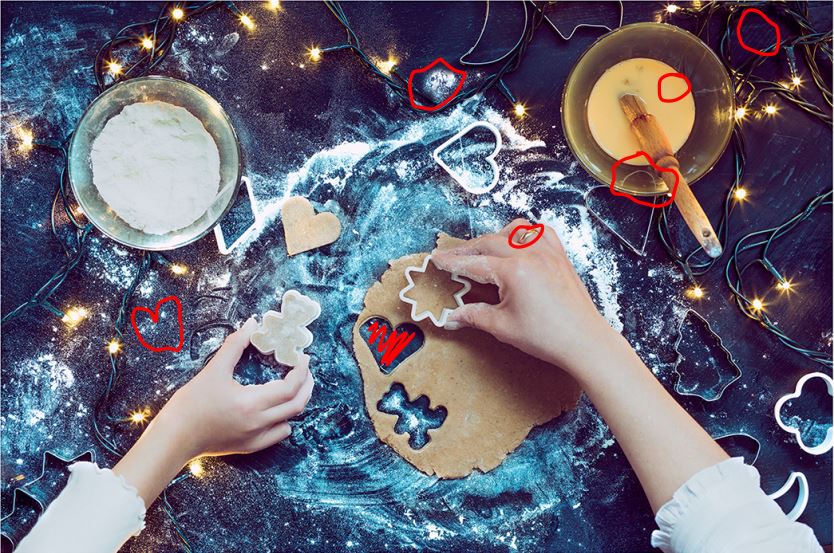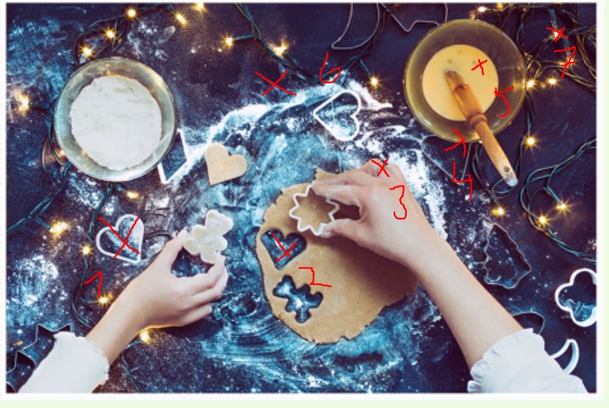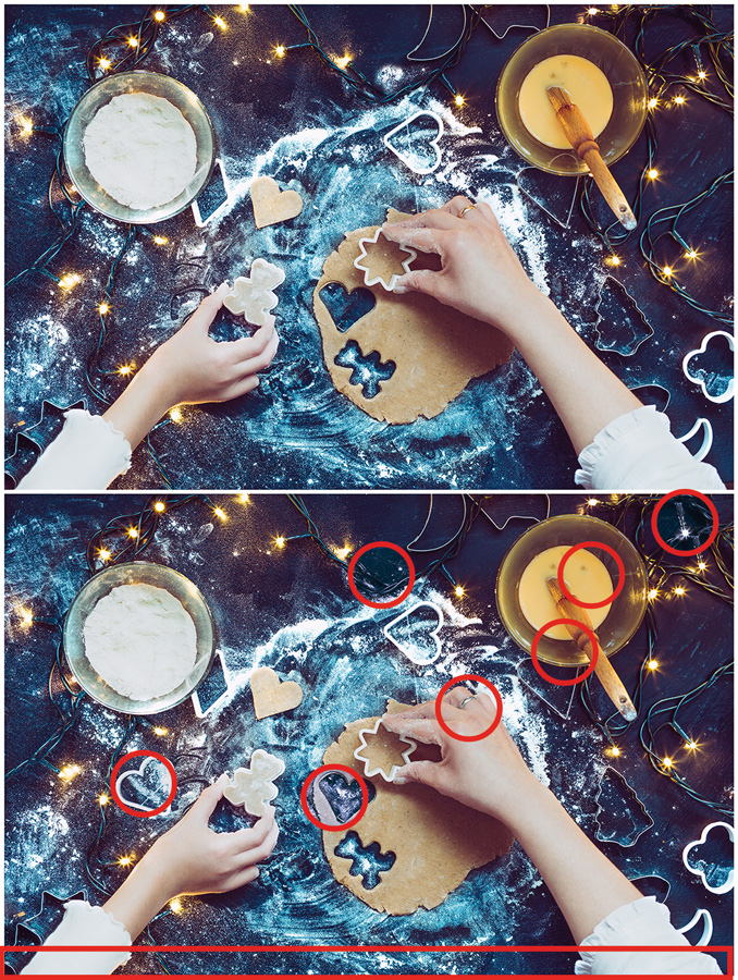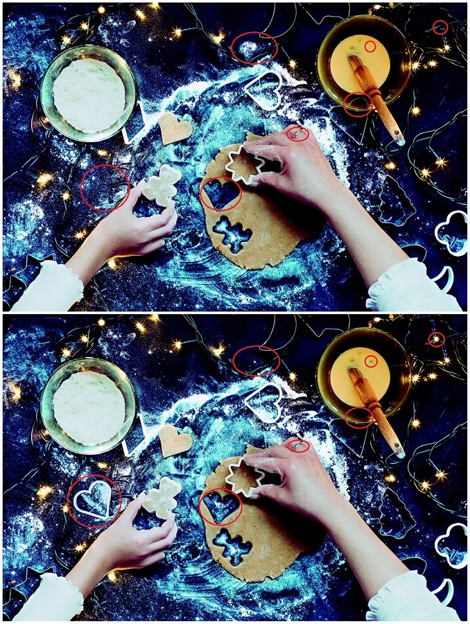 1 . oben rechts ist ein Licht weniger 2. in dem Schälchen ist ein dunkler Fleck weniger 3. am Rand der Schale ist ein Teil vom Herzausstecher sichtbar 4. am Bild oben in der Mitte fehlt ein kleines Mehlhäufchen 5. es fehlt das Herz neben der linken Hand 6. Die Farbe des Ringes ist mal Gold, mal Silber 7. In dem ausgestochenen Herz innerhalb des Teiges fehlt ein kleines Mehlhäufchen Liebe Grüße Albine