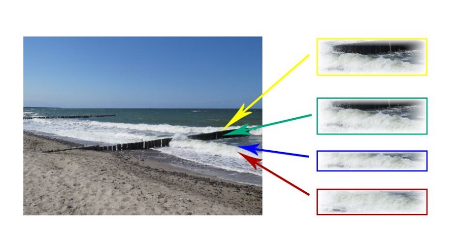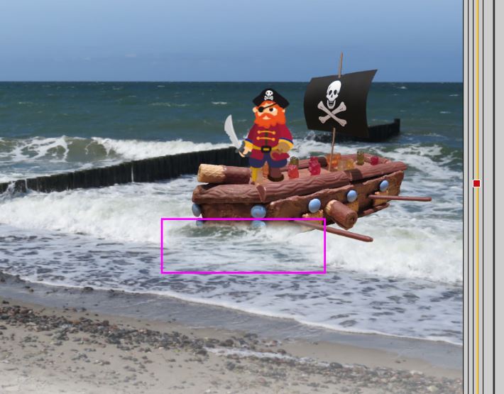 Kleine Ausschnitte vom Strandbild (Wellen) habe ich mehrfach kopiert, mit Verläufen belegt und dann so eingefügt, dass es so ausschaut, als würde das Schiff im Wasser schwimmen.