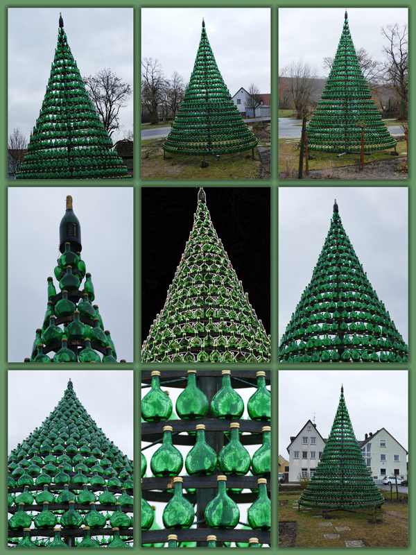 Re: 23. Dezember | Kategorie: FotografieVon mir gibt es 9 Varianten des Nordheimer Weihnachtsbaumes. Er wurde aus 1099 Bocksbeuteln (0,25 l) gefertigt und steht unweit des Main-Ufers. Die Spitze ziert eine Magnum-Sektflasche. Das Foto in er Mitte ist mit Photoshop nachbearbeitet worden.