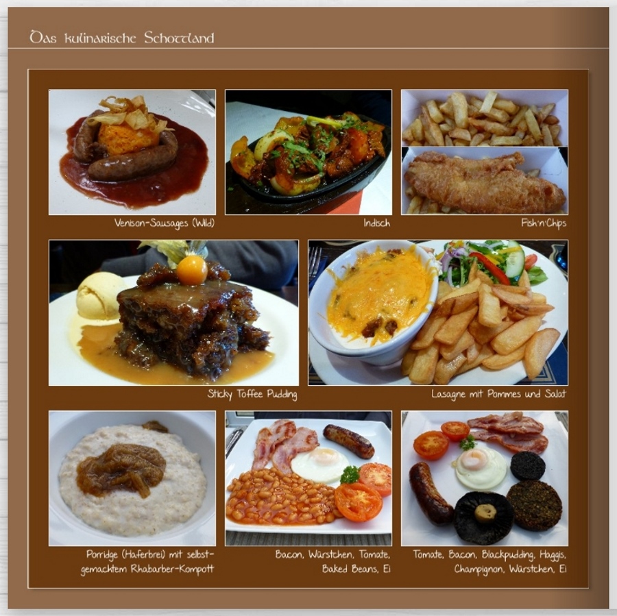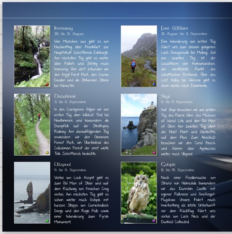 Frauke Re: 11. Dezember | Kategorie: KreativesDie erste Doppelseite aus unserem Schottlandbuch zeigt links die 6 Stationen in denen wir bei unserer Rundreise Quartier bezogen haben, rechts ist dann eine entsprechende Übersichtskarte (die Seite erfüllt zwar nicht die Bedingung von 5 Fotos aber die Doppelseite wirkt sonst nicht richtig, daher hänge ich sie zusätzlich an..).