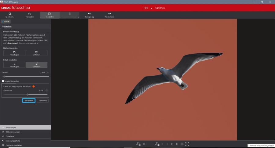Die Möwe von der Originalseite aus dem Fotobuch ist mit gimp ausgeschnitten, für die Aufgabe habe ich sie in der Fotoschau neu ausgeschnitten. Für den besseren Überblick habe ich das Bild zuerst mit Zuschneiden verkleinert.